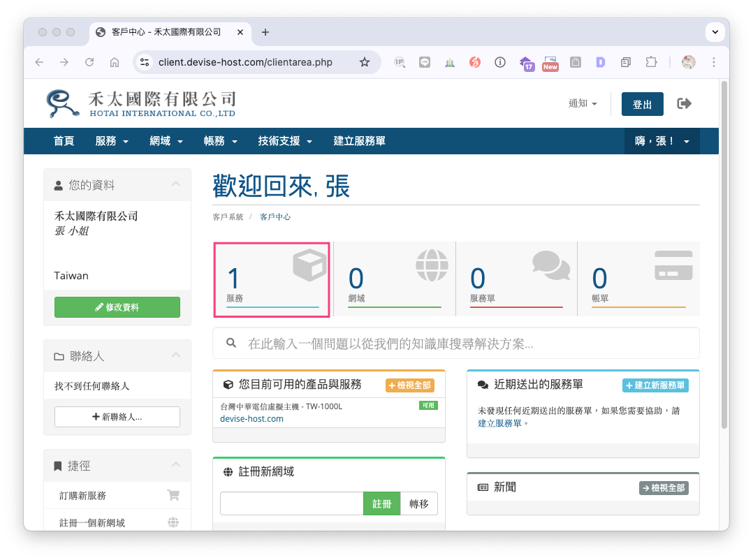Step1,請您登入我司客戶專區,然後點擊『服務』,如下圖:
